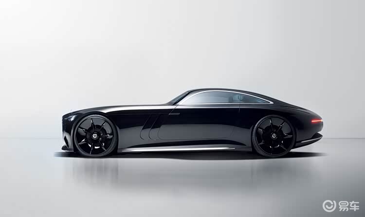 引擎盖上的三叉星徽立标首次采用发光设计,与可编程的格栅动画效果共同增强了车辆的科技感和品牌辨识度。 前大灯应用了最新的照明技术,与深黑色高光车漆相配合,突出了车身的雕塑感。 超长的车头设计媲美传统V12动力燃油车,车窗轮廓与腰线呼应了W112的经典比例。