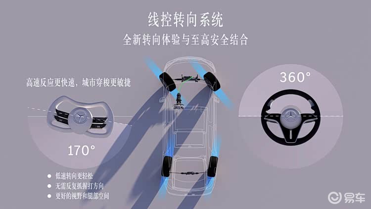 后轮主动转向系统与线控转向技术配合,大幅提升车辆的操控性和泊车便利性。 转向系统提供360度高速反应和170度低速转向能力,使城市穿梭更轻松。 线控转向技术还为内饰设计提供更大灵活性,配合自动驾驶系统,驾驶员可以获得更为放松的坐姿。