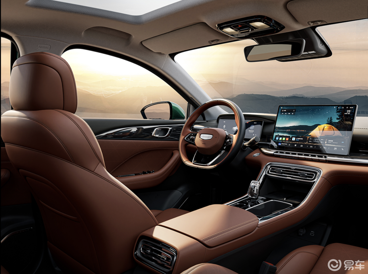 【豪华配置】内饰采用大量皮革包裹,配备全景天窗及座椅通风/加热/按摩等舒适功能,取消实体按键,主打智能语音交互。