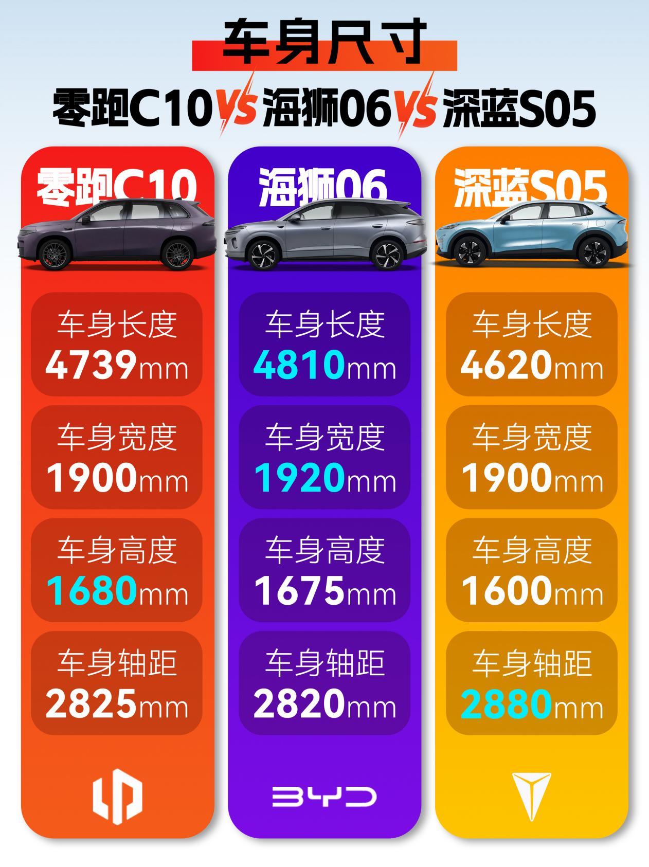 零跑C10纯电版配备了全域800V高压碳化硅快充平台,74.9kWh的大容量电池,纯电续航605公里。如果每天通勤50km,算上消耗,基本可以10天不充电,减少充电烦恼。而电车大家最不喜欢的就是超长的充电时间,26款零跑C10电量从30%充至80%的时间缩短至16分钟。深蓝S05纯电版搭载宁德时代电芯的68.82度磷酸铁锂电池,CLTC纯电续航620公里,支持3C充电倍率,因为电池容量比零跑C10小一些,所以电池从30%-80%充电时间只要15分钟。海狮06 EV入门版搭载65.28kWh电池,纯电续航520公里,最大快充功率195kw,电池从30%-80%充电时间需要18分钟。在售价基本一致的情况下,能够看到零跑C10电池容量最大,纯电续航605公里,要比海狮06 EV的电池容量和续航里程多出不少。虽然续航不及深蓝S05,但是零跑C10车身尺寸整体要大了一圈。