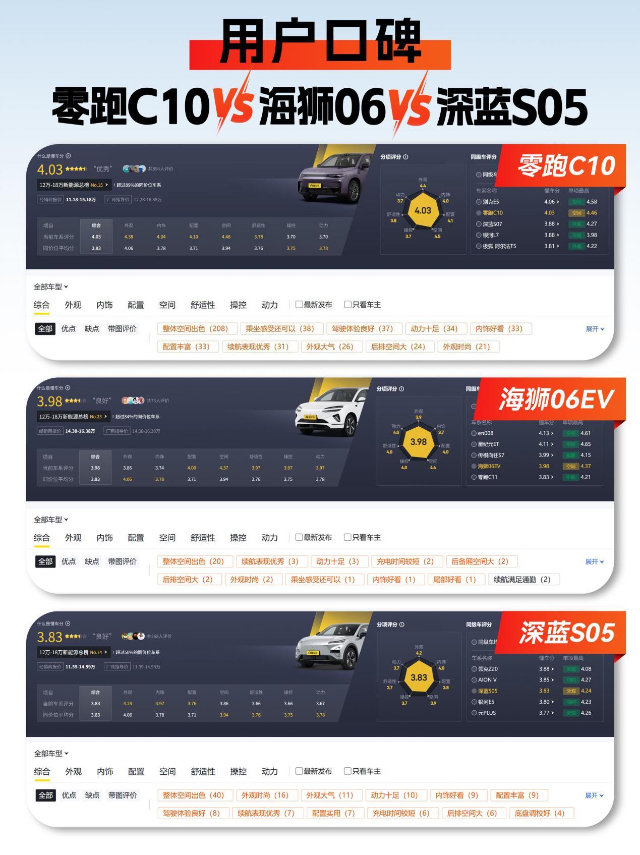 车主论坛与用户口碑上的真实评价,勾勒出三款车的立体画像。零跑C10车主最常提及的关键词是“整体空间出色”、“后排空间大”、“驾驶体验良好”、“动力十足”,