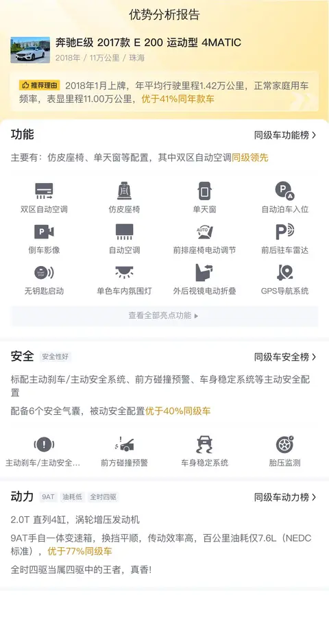 综上所述,这辆奔驰E级2017款E200运动型4MATIC是一款集豪华、性能与舒适于一体的二手车。它在外观设计、动力操控、内部空间、安全配置以及内饰智能等方面均表现出色,无论是商务出行还是日常驾驶,都能为驾驶者和乘客提供优质的驾乘体验。在合理的价格下,它为消费者提供了一个性价比高的豪华车型选择。当然,在购买二手车时,车况始终是最重要的考虑因素之一。建议潜在买家在决定购买之前,务必对车辆进行彻底的检查,包括车辆的历史记录、行驶里程、保养状况以及是否存在任何潜在的问题等。如果可能的话,最好能请专业的第三方机构进行检测,或者带着懂车的朋友一同看车。这样可以更准确地评估车辆的实际状况,避免因车况问题带来的潜在风险。总的来说,如果您正在寻找一辆性价比高、性能出色且豪华舒适的二手车,那么这辆奔驰E级2017款E200运动型4MATIC无疑是一个值得考虑的选择。它的合理售价、较低的用车成本以及卓越的综合表现,使其在二手车市场上具有较高的竞争力。当然,购买二手车是一项重要的决策,需要根据个人实际情况和需求进行权衡。希望本文提供的信息能够帮助您更好地了解这款车,并为您的购车之旅提供有价值的参考。