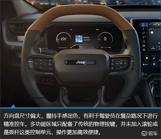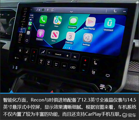 Jeep Recon的内饰秉持着实用主义,以规整布局搭配双屏交互系统,兼顾了操作便利性与科技感。耐磨防水的材质非常符合其硬派越野车的定位,虽然乘坐空间中规中矩,并无亮眼之处,但是车内强大的储物能力确实很有吸引力。无论是应对日常家用场景还是装载大量的户外装备,都能够游刃有余。