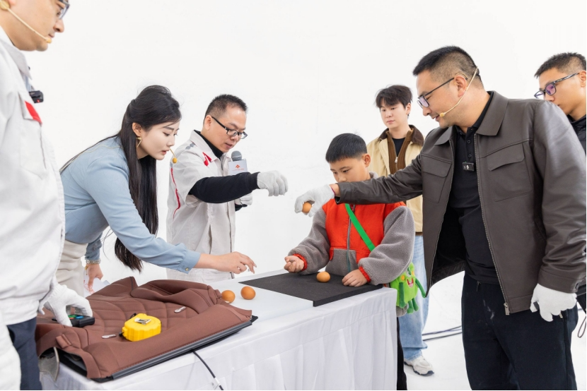 其次是座椅材质的安全性。全粒面超柔Nappa真皮表面光滑无毛刺,不会刮伤孩子娇嫩的皮肤;座椅内置的慢回弹海绵柔和有弹性,孩子在座椅上蹦跳玩耍时,能有效缓冲撞击力,减少摔倒受伤的可能。现场测试中,鸡蛋从一定高度掉落至座椅上完好无损,足以证明其缓冲性能的优异。
