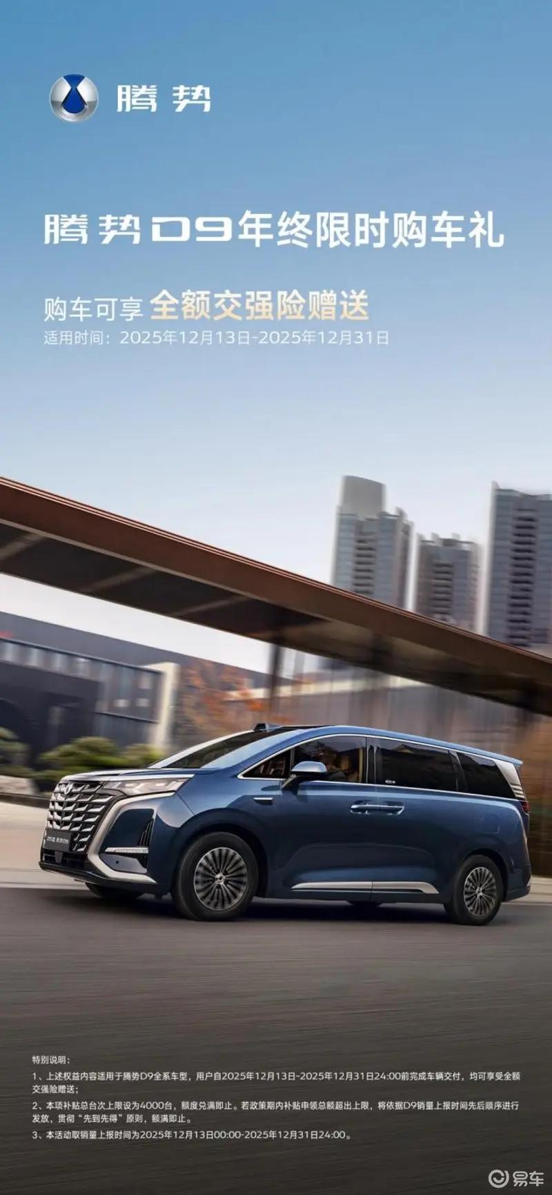 在内地市场,腾势汽车近日正式开启“腾势 D9·感恩 30 万+”年底感恩活动,即日起至2025年12月31日,凡购买并完成交付腾势D9的用户,均可享受全额赠送交强险权益,腾势D9全系车型均可参与。本次补贴上限为4000台,额度兑满即止,若政策期内补贴申领总额超出上限,将依据D9销量上报时间先后顺序进行发放。