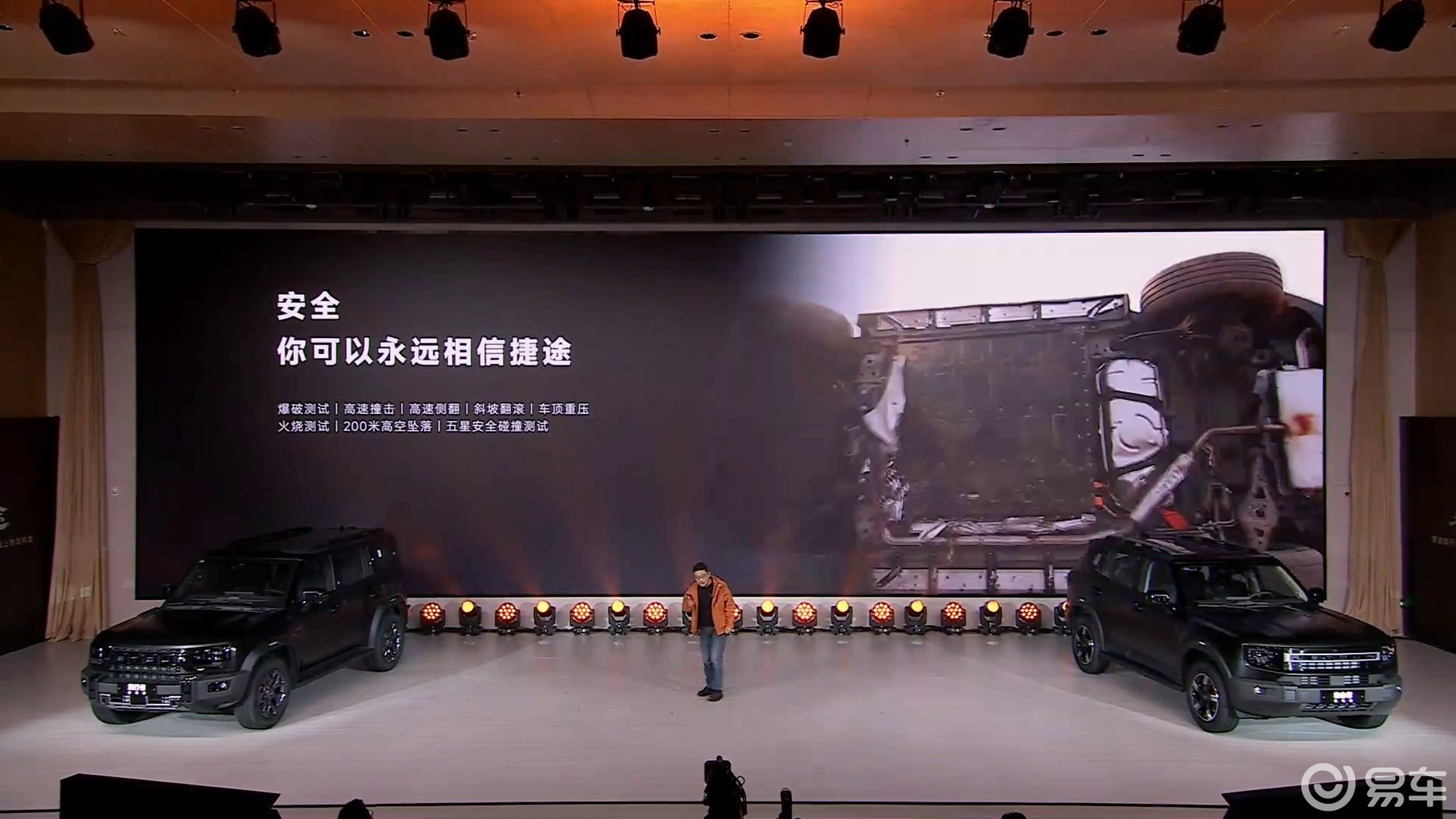 发布会披露,旅行者骏马版车顶可承受140kN静压(约等于一头成年大象的重量),扭转刚度31000N·m/°,两轮悬空状态下5个车门仍可正常开关。整车须通过爆破、高速撞击、高速侧翻、斜坡翻滚、车顶重压、火烧、200米高空坠落、五星安全碰撞共8项测试方可出厂。