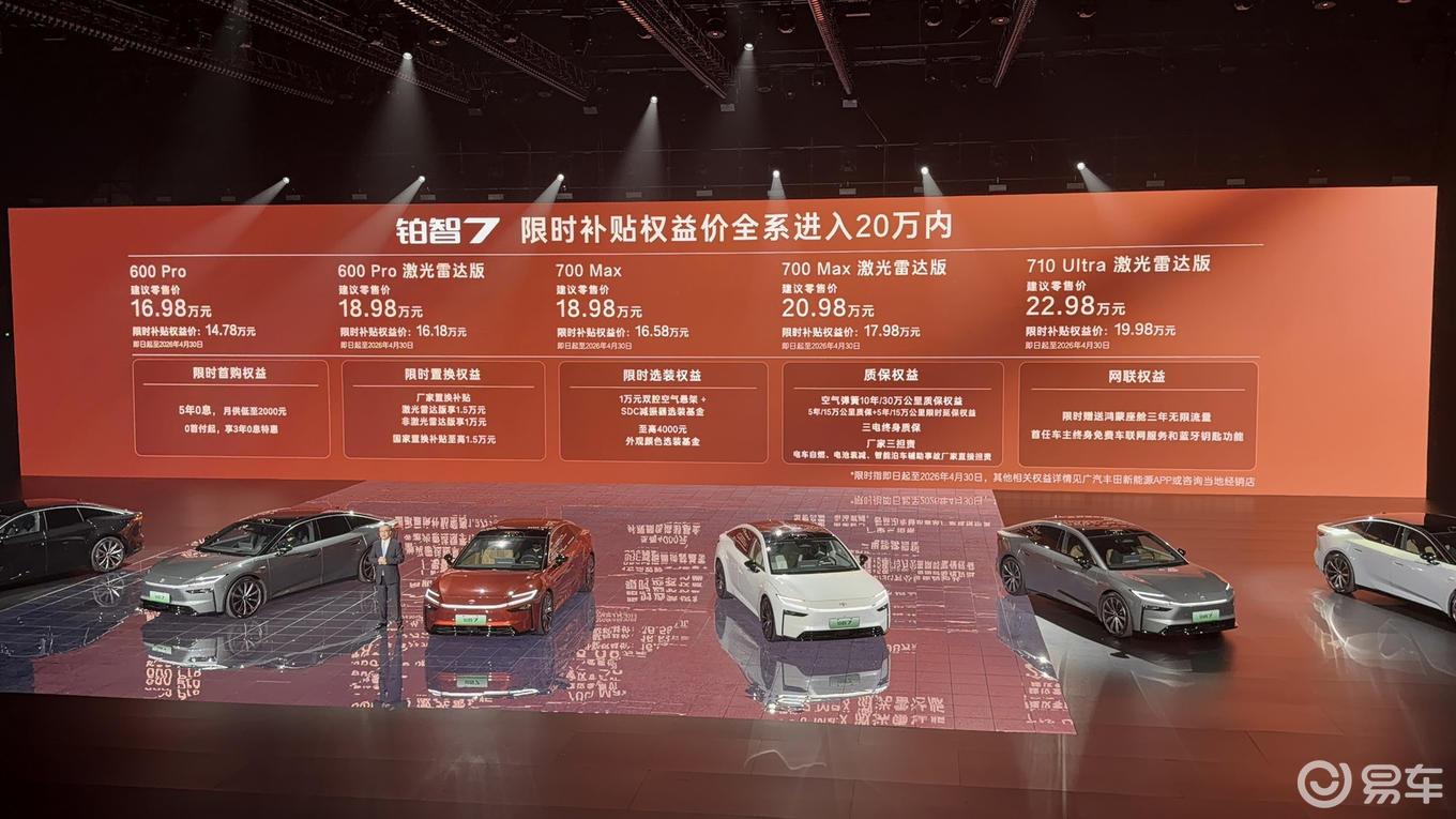 作为丰⽥史上最宽纯电轿⻋、⾸款搭载双腔空悬的纯电车型,铂智7共推出5款配置,官方售价16.98万元至22.98万元,限时补贴权益价14.78万起,相比预售阶段,价格再次下调,综合后全系进入20万内。