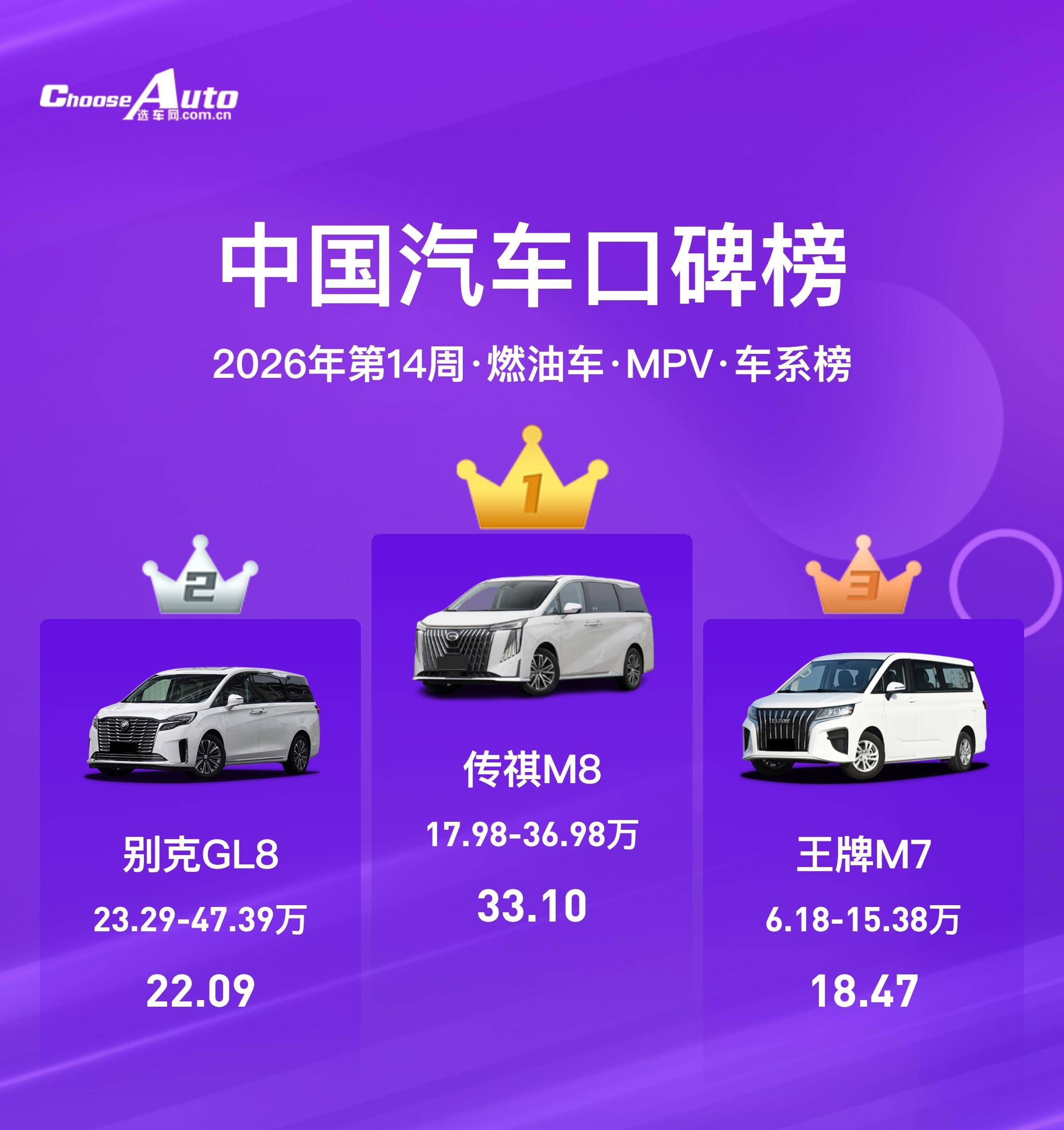 MPV榜单的数据最值得关注。传祺M8以33.10分登顶,别克GL8(22.09分)和王牌M7(18.47分)紧随其后——但三者的分数都远低于轿车和SUV榜单。