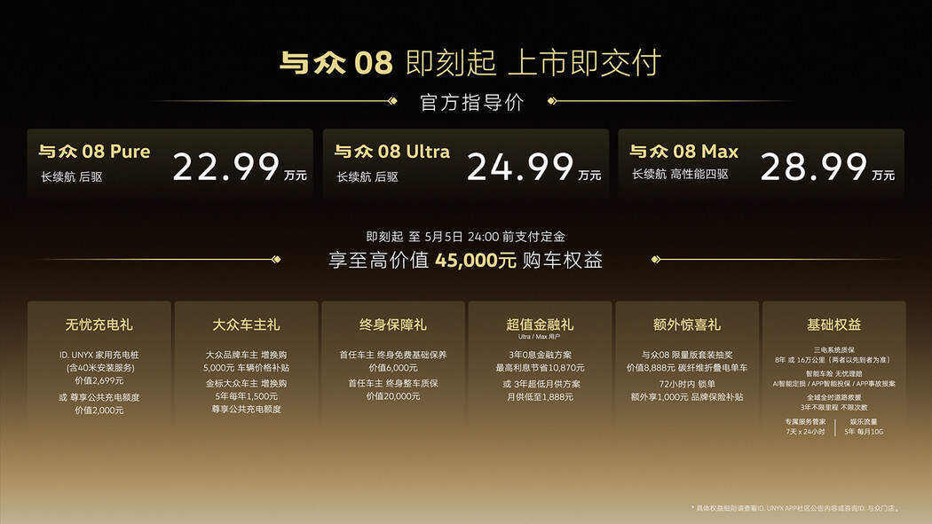 先聚焦最具诚意的权益:自即日起,至5月5日24点前完成定金支付,即可解锁价值2699元的ID.UNYX家用充电桩,或等额充电额度;大众老车主若选择增购或换购,立享5000元直减优惠,金标大众老车主的福利更胜一筹,连续五年,每年均可获赠1500元充电卡;首任车主直接收获价值6000元的终身免费基础保养,外加价值2万的终身整车质保;Ultra与Max版本更是推出3年免息政策,月供方案灵活可选,这般贴心举措,无疑是将用户关怀做到了极致!