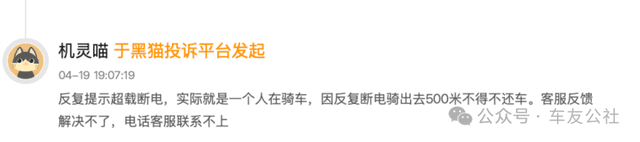 还有消费者反映了松果出行电单车的故障问题:“反复提示超载断电,客服反馈解决不了,电话客服联系不上。”
