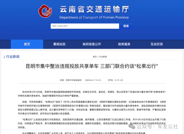 值得关注的是,就在前不久,松果出行刚因同类无牌违规投放行为,在昆明被多部门联合查处。2026年4月16日,昆明市交通运输局发布官方通报,明确自4月13日起,陆续接到市民举报,当地多个区域出现大量松果出行无牌共享电单车,经查该企业违反《中华人民共和国道路交通安全法》《昆明市互联网租赁自行车管理办法》等多项规定,擅自强行投放大量未办理审核登记及上牌手续的共享电单车,且存在车辆无序停放挤占公共空间的问题。4月15日,昆明市交通运输、城市管理、公安交管三部门已联合约谈松果出行,对其提出严肃批评,责令限期清理回收全部违规投放车辆,逾期未整改将依法采取行政强制措施。车友公社同时了解到,在2026年2月昆明市主城区互联网租赁自行车运营服务主体公开选取中,松果出行运营主体北京阿帕科蓝科技集团有限公司并未入围最终名单。