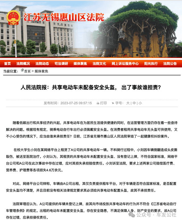 此外,车友公社了解到,如果骑行无牌共享电动车发生交通事故,责任划分更为复杂。从日前江苏省无锡市惠山区人民法院审结的一起案件,我们或许可以获得相关启示。在校大学生小刘在某网络平台上租赁了一辆A公司的共享电动车。不料在骑行过程中,小刘因车辆侧翻造成头皮撕裂伤,后被送至医院治疗。小刘认为,其租赁的共享电动车未配置安全头盔、没有登记上牌,不符合国家标准,网络平台公司和A公司在此次事故中存在过错,应对其损失承担赔偿责任。小刘诉至法院,要求上述两家公司赔偿医疗费、营养费、护理费等各项损失46000余元。法院经审理认为,A公司提供的车辆未登记上牌,故其向市场投放共享电动车的行为并不符合《江苏省电动自行车管理条例》的规定;出租的共享电动车未配置安全头盔,存在安全隐患,不满足保障人身、财产安全的要求,故A公司存在过错,应承担侵权责任。